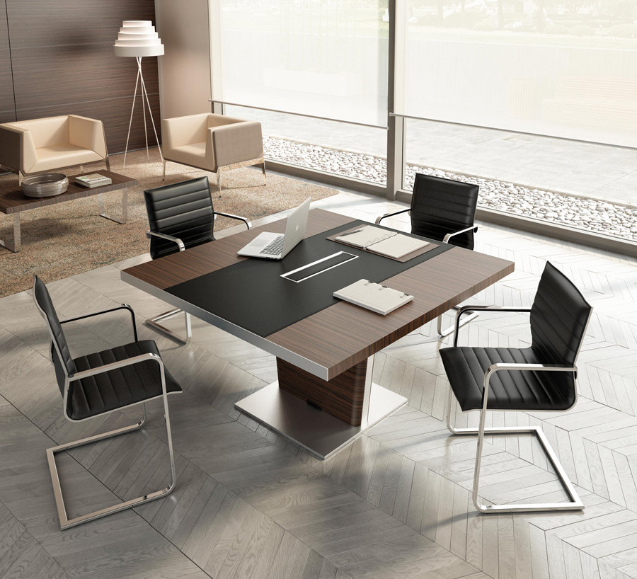Eksklusivt konferansebord i finér med detaljer i børstet krom og og skinndekket bordeplatta.