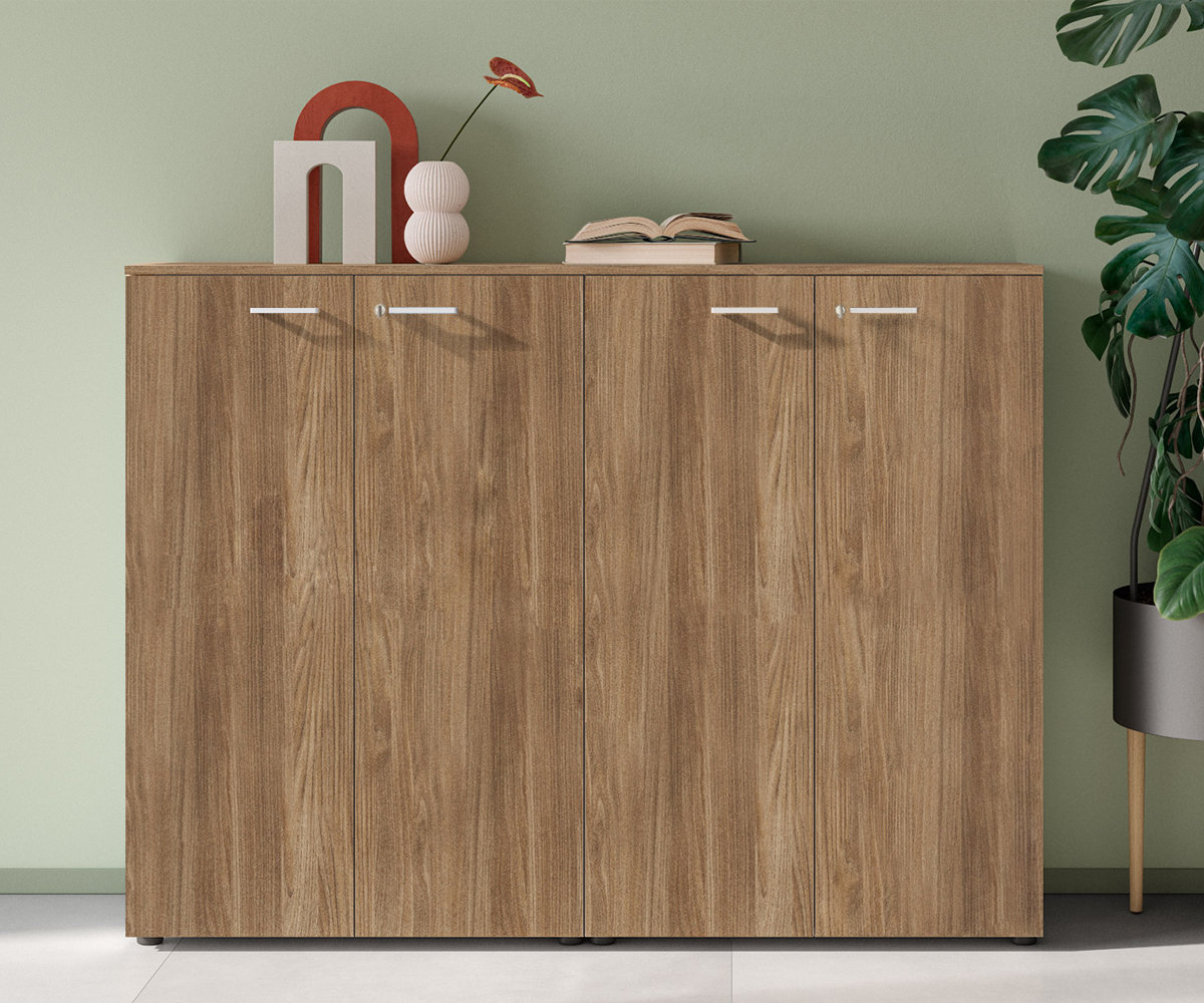 Oppbevaring med dører som kan låses og hylleplan som kan flyttes.