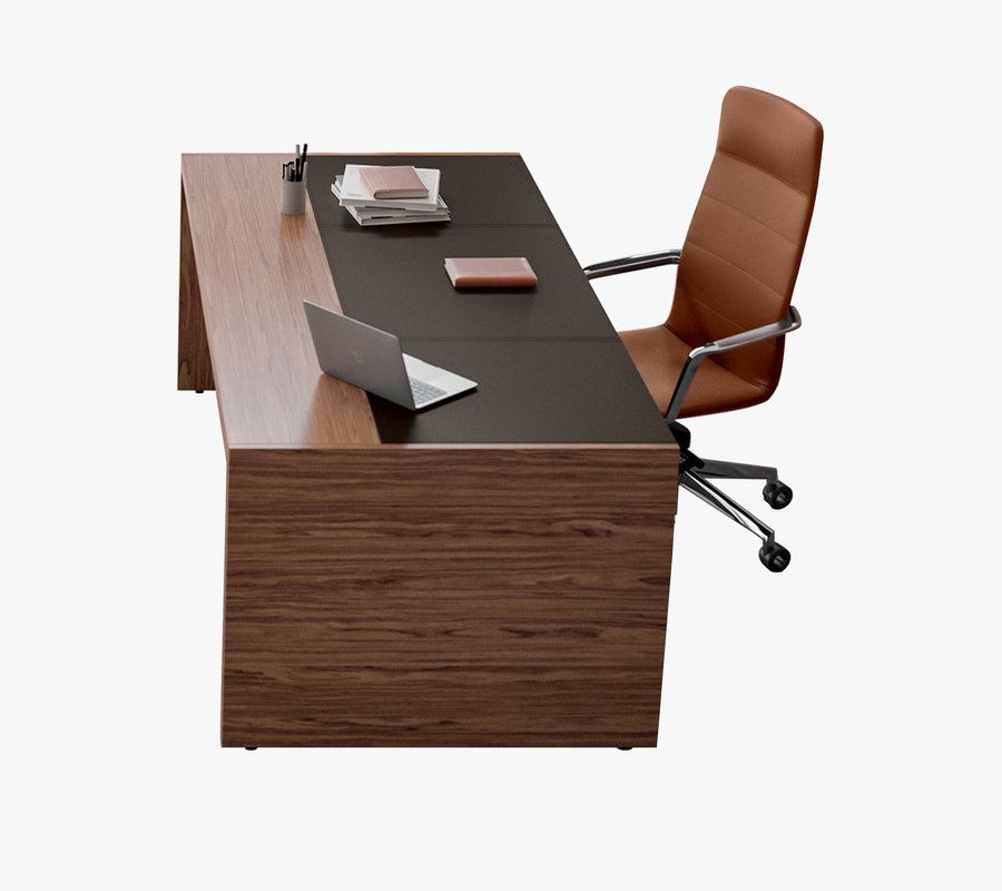 Nona Skrivebord i rett design med eksklusiv topp i finer med skinninnlegg satt inn i toppen. Kombinert med pen panelbenfiner. Dens rette design og pene dimensjoner gjør det enkelt å innrede på det moderne kontoret uten å ofre kvalitet og design.