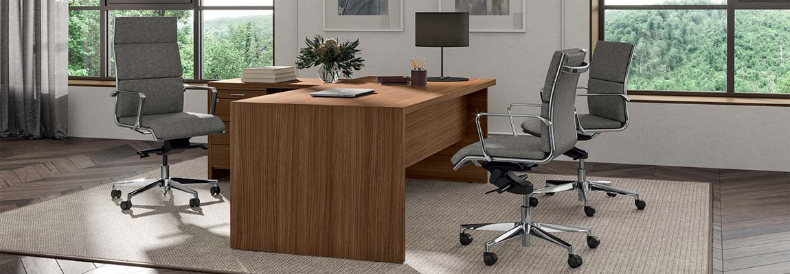 varianter. Enkel rett skrivebord, med sidebord og skuffesekjon, med skap eller høydejusterbar.